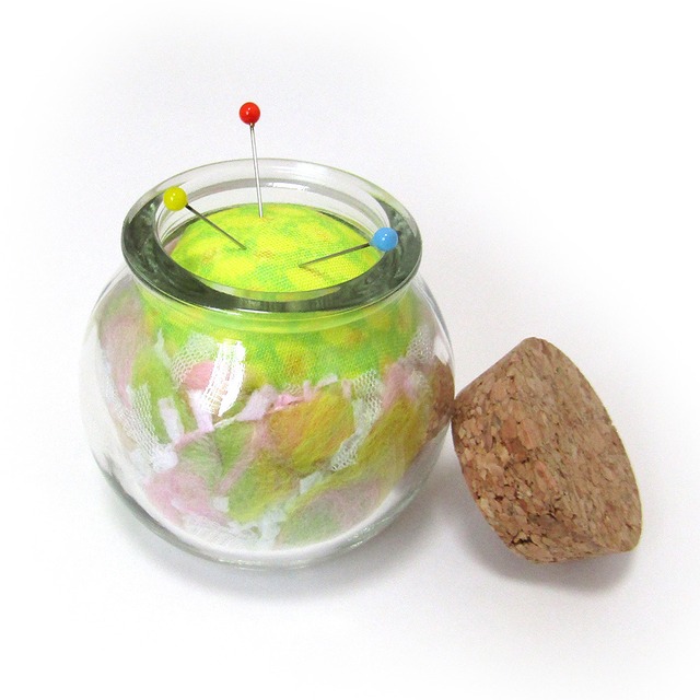 コロンとしたフォルムが可愛い、ビンのピンクッションです。