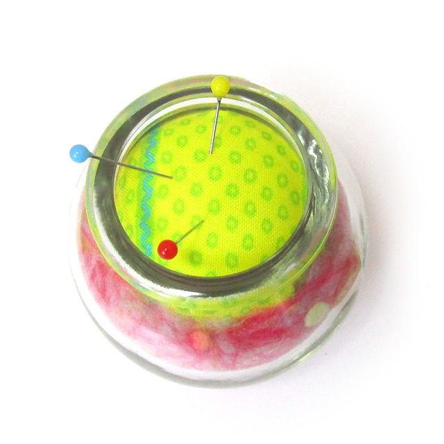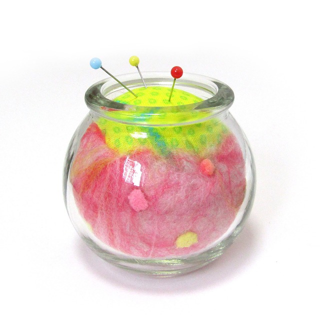 コロンとしたフォルムが可愛い、ビンのピンクッションです。