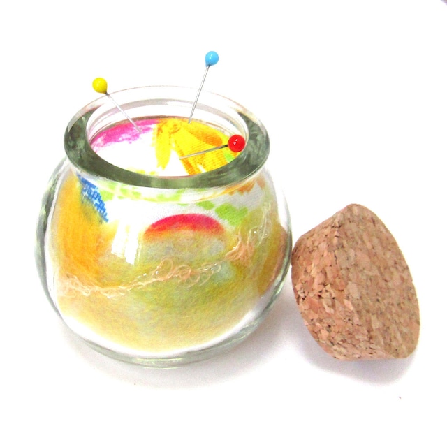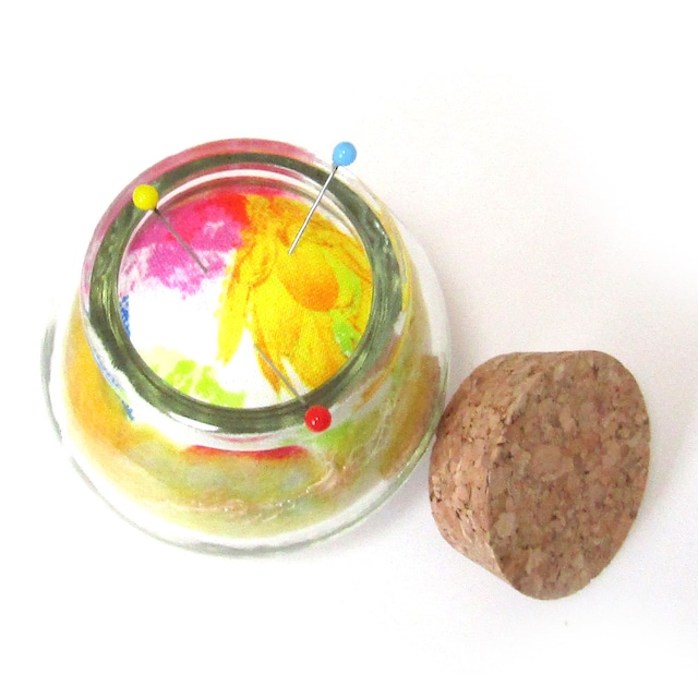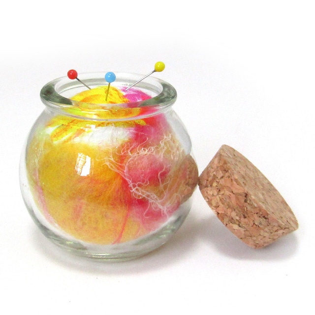 コロンとしたフォルムが可愛い、ビンのピンクッションです。
